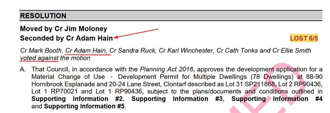 In accordance with Standing Orders, Cr Hain's vote as Seconder is to be taken as FOR the motion, making the result PASSED 6/5.